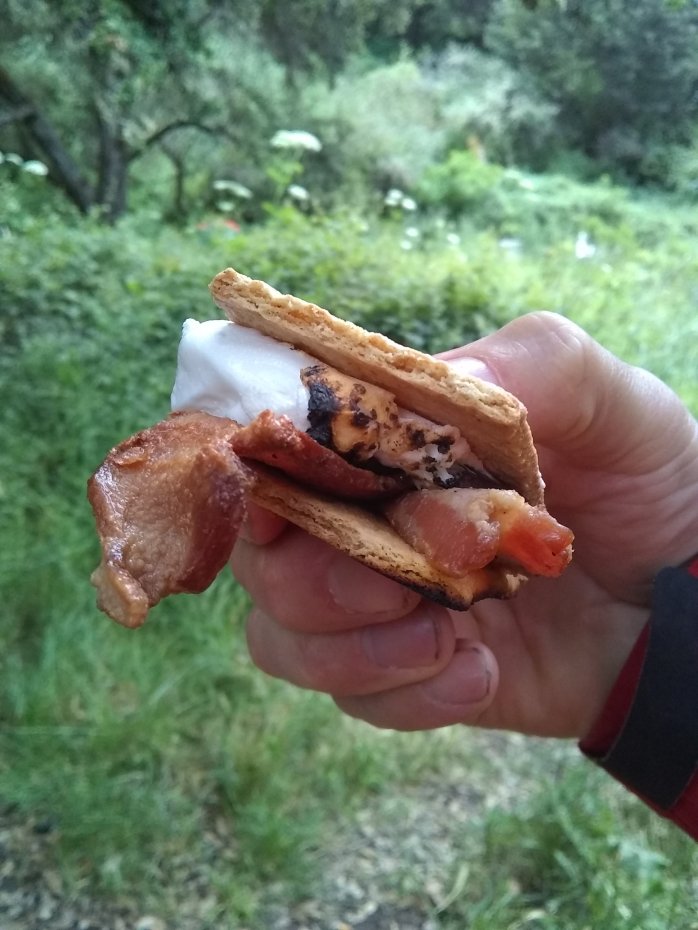 Delicious venison sliders and bacon laced s’mores. Yum yum yum after a long day of hiking the long way to Glenn Camp.