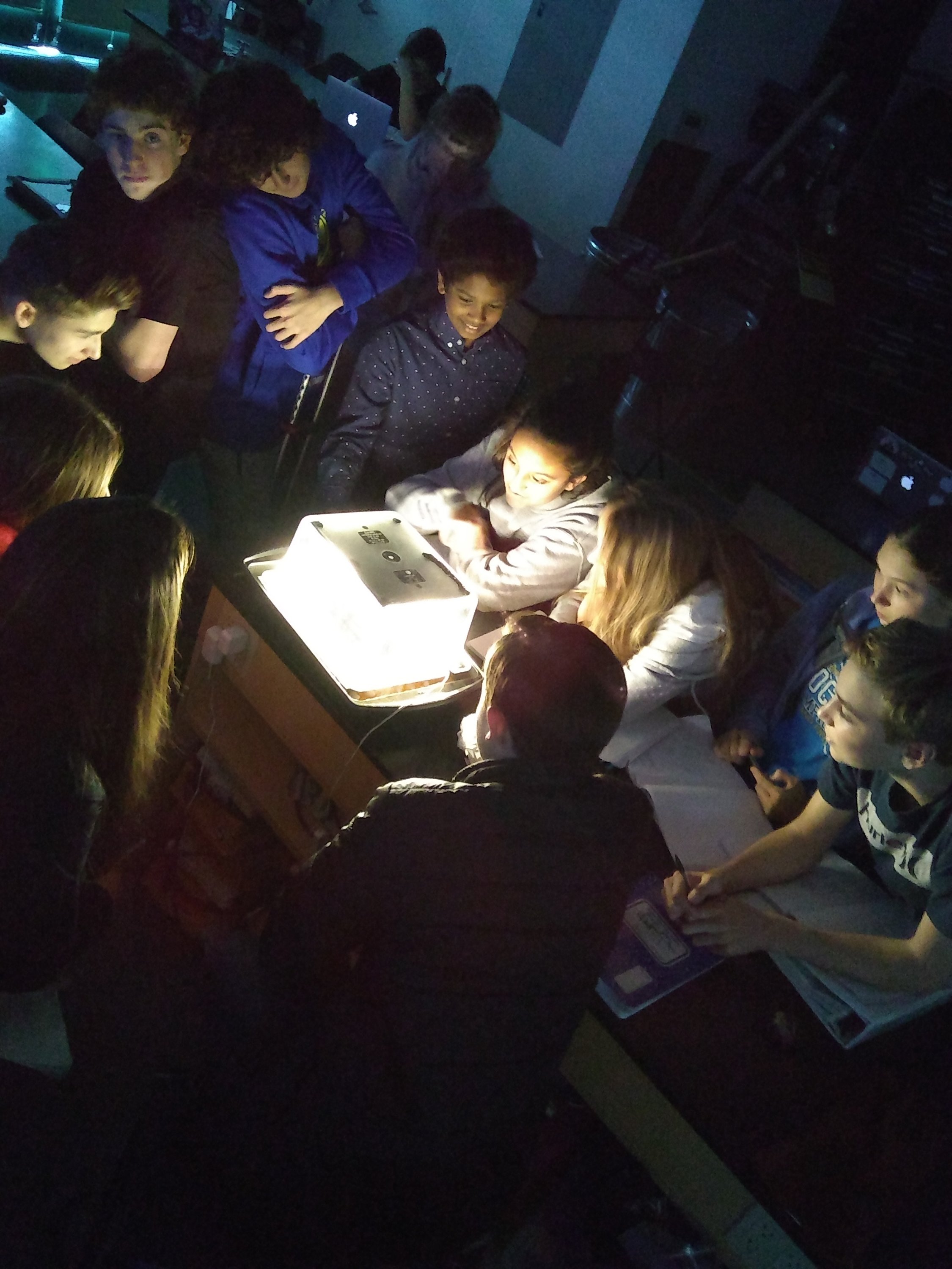 Homemade cloud chamber with students watching for naturally occurring tracks.